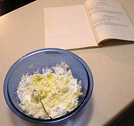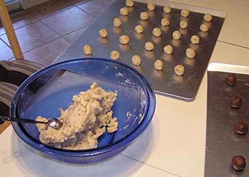While Ellen worked on the Mocha Nut, I made the dough for Butterballs, from my Mom's recipe in the Klein family cookbook I put together many years ago. The key ingredients are butter (as you might guess) and chopped walnuts. The above two ball cookies are easy to make, and complement each other well, the Yin and Yang of spherical cookies.