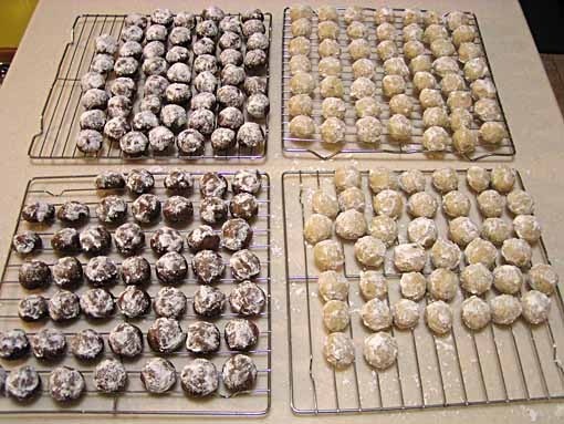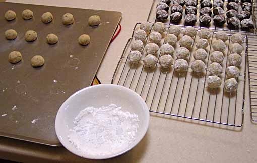 After their baked, I garnished both with powdered sugar, though the Butterballs are rolled in it while warm, forming a sort of snowy icing, while the Mocha Nuts just have the tops dipped after completely cool. Ellen doesn't like too much sugar on them.
