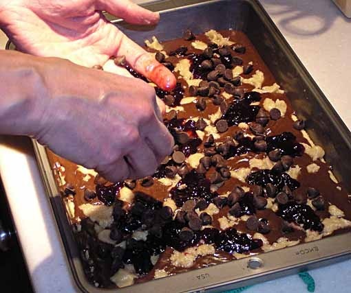 …and it's topped with more chocolate (chips) and dollops of raspberry jam and more dough.