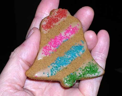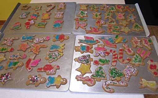 My part with these is helping with the decorating after they're baked and cooled. Usually I make batches of colored icing (as seen in the 2008 post), but this year when prepared to do that I found we had no food coloring at all. We'd brought ours up to Ann's last Christmas and forgotten to get more. So, we just used the white icing and colored it with sugar crystals and candies. Worked fine.