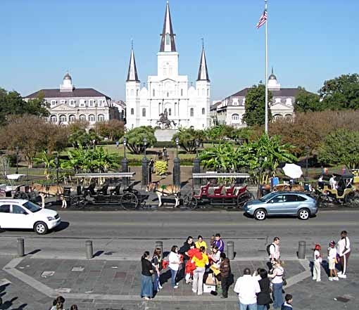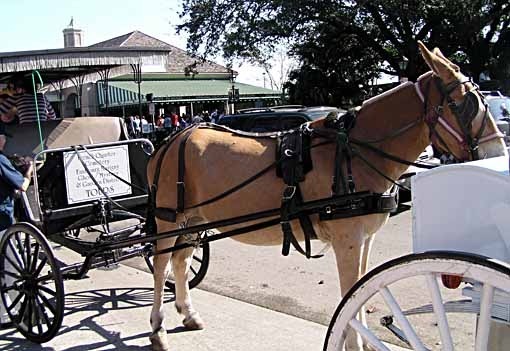 Friday morning in New Orleans, our last, was again sunny and comfortable. After breakfast outside in the French Market we walked along the river to Jackson Square, where mule-driven carriages line up to give half-hour tours of the French Quarter. We thought that would be a good way to wrap up our visit.