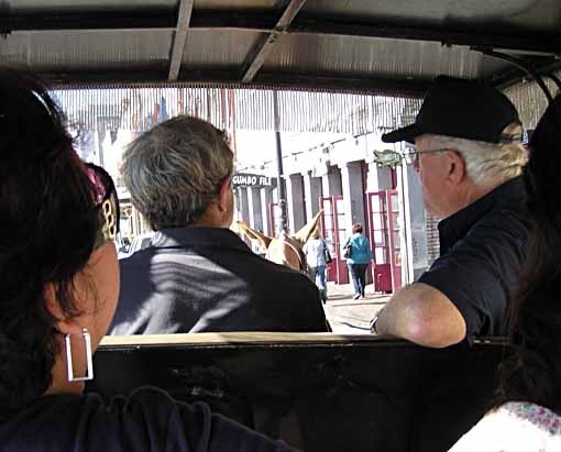 Here's the carriage we chose, or were beckoned into. We'd been seeing them regularly trotting through the quarter, all mule-powered, and I asked the driver, "Why mules?" His answer was, "They're smarter than horses. They won't work themselves to death; when they've had enough, they just stop. Also, they can handle the summer heat better, and store more water than a camel."