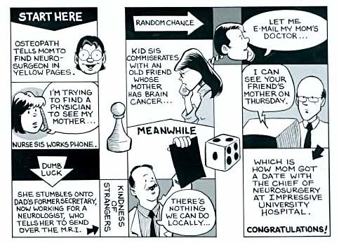 This book is a great example of how comics can make any subject interesting, sympathetic and understandable, however. The very act of telling a story with pictures invites readers into a world, and when the art is as charming as that of Brian Fies, it becomes a world one wants to continue visiting, page after page. And facing crushing problems and situations with a humor and clever visuals, as above, is comics at its best, in my opinion.