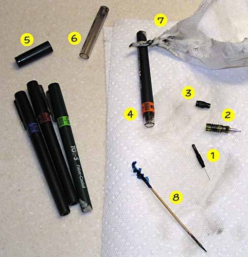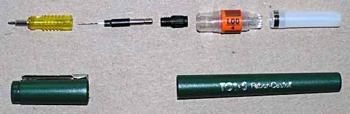 This will probably make more sense in the picture above, where the pen pieces are shown in order. Also shown in this pic is the ink reservoir, which pulls off the point body after it's unscrewed from the pen shaft. The pen cap (5) and the pen shaft are the only parts that don't have to be cleaned.