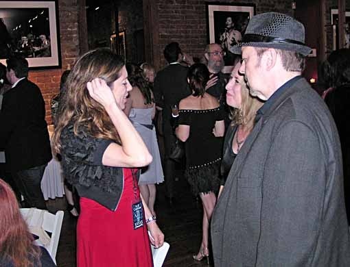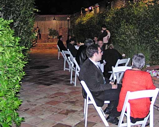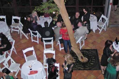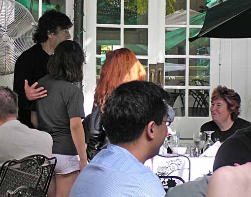 …and an outside patio, the quietest and most appealing area to us, but unfortunately also the smoking area, so we didn't spend too much time there. One sad bit of news was that Scott McCloud, who we'd run into on the street earlier in the day, hadn't made the party, he was in the hospital with an as yet undiagnosed but painful internal problem, as we heard from his wife Ivy, who came for a while to explain. We wished Scott well and a speedy recovery. We hope to hear news of him soon. I met Amanda Palmer, Neil's fiancé, briefly on the patio, but she was rushing about as busily as Neil, and I'm sure many of the guests were her friend invites, too.