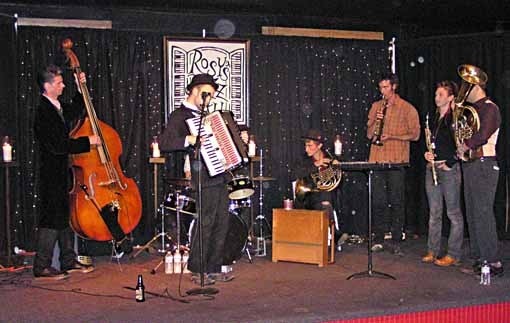 Then the band came on, and I'm afraid I didn't catch their name. It was an eclectic group, with the lead vocalist on accordion, a stand-up base, drums, and four horn/woodwind players. The sound was a bluesy/zydeco sort of mix, and I liked it, the only problem being the vocalist was not miked well, and we couldn't understand a word of what he sang.