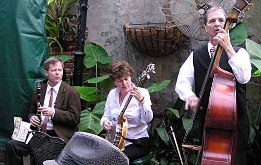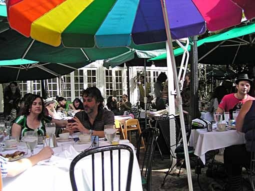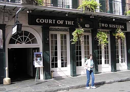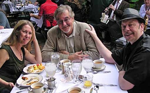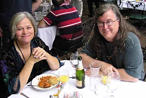 Thursday late morning we were invited to join Neil Gaiman and friends for a Jazz Brunch at the Court of Two Sisters on Royal Street in New Orleans' French Quarter. This was a "make your own reservations but well all sit together in the courtyard" affair. Oh, that's Ellen in front. We'd passed the restaurant several times in our wanders through the French Quarter, but somehow forgot exactly where it was when we needed it, but eventually got there.