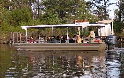 In the afternoon we thought we'd do one of the many tours offered in the area, and decided on the Swamp Tour. I called and made a reservation and arranged for them to pick us up outside the hotel. We'd be driven miles out of the city to Honey Island Swamp for the tour. We first had to pick up folks from other hotels, and noticed others from Neil's party were going, too. We spoke briefly to Shawna McCarthy, the editor who bought one of Neil's first books, "Good Omens," and said hello to Ellen Datlow, but they ended up taking a different swamp boat, like the one above. Each boat holds about 20 plus the driver/guide, and three boats went out.