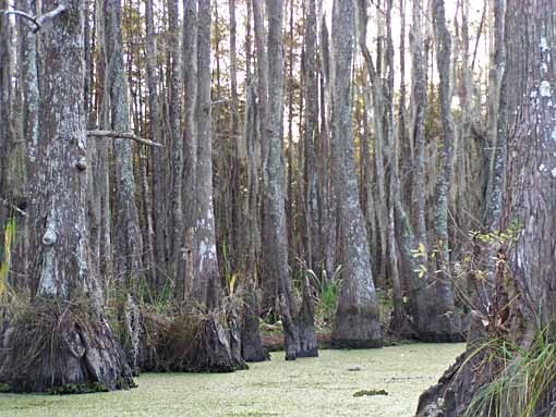 In smaller tributaries the swamp was at its most beautiful, dominated by tall Cypress trees, waterways full of tiny leaved plants similar to duckweed. I don't recall the name of these, but our guide told us they bloom once a year, covering the water with tiny white blossoms, the closest thing to snow most residents ever see.