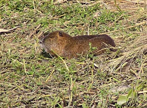 This is a Nutria, or as Ellen said, a giant Guinea Pig. They are not native, but were brought in as an attempt to help local fur trade in the nineteenth century. As usual, it was a misguided disaster: the animals' fur turned out to be unwanted, they multiplied like the rodents they are, and unlike native species, they destroy the swamp plants they eat, ruining the ecosystem. There's now a bounty on them to encourage locals to hunt and kill them, which helps some, but there's no danger of the animals being wiped out.