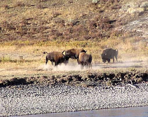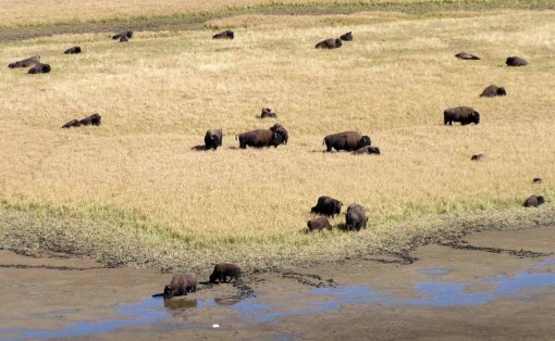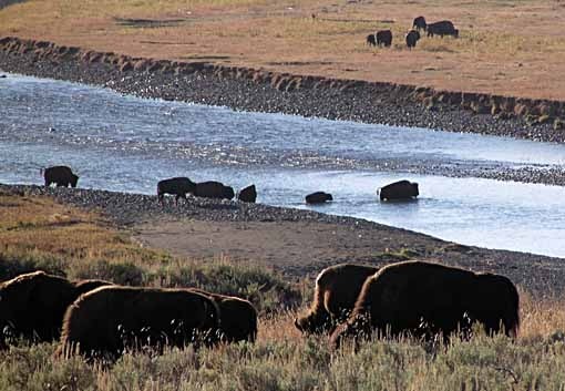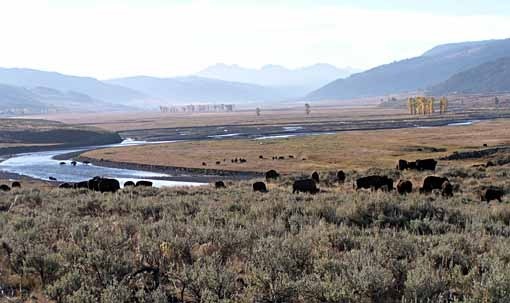Herds of bison were spread across the grassy valley. Some were crossing the Lamar River…