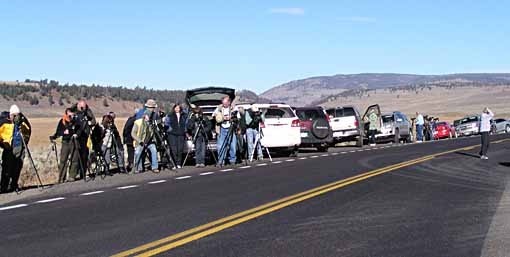 The mammals Ellen most wanted to see were Wolves, and when we saw this gathering of watchers beside the road near the old Buffalo Station (where Bison were reintroduced to the park in the early twentieth century), we correctly surmised that wolves were nearby. Actually, just barely visible on a ridgetop with our binoculars, a little easier to see with scopes, which the Wolf Watchers kindly let us see through. This was the Lamar Valley Pack, and they live around that ridge, so crowds of hopeful watchers do too. Not great looks, way too far for photographs, but at least we saw them. And we got to hear them all howl together, too, a wonderful sound.
