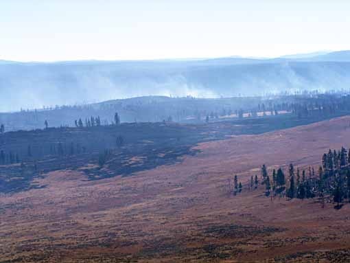 Our route took us down the east side of the Yellowstone grand loop road, and over Dunraven Pass, which had been closed most of the time we've been out here due to a forest fire. We could still see it smoldering in the valley below. This fire had been started by lightning, then managed by the park fire fighters into a controlled burn. We'd seen the smoke some days, but not been affected by it.