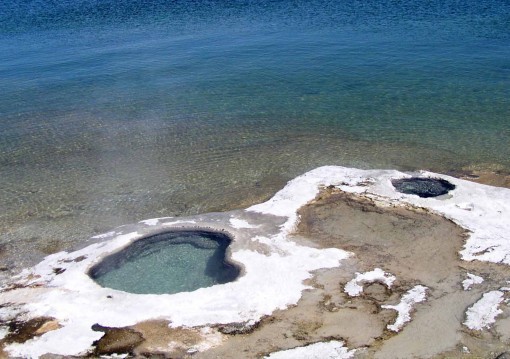 On our first day here we'd passed by the Great Thumb Geyser Basin, so we toured it now. Perhaps the most unusual thing here is the geysers right on the lake shore.
