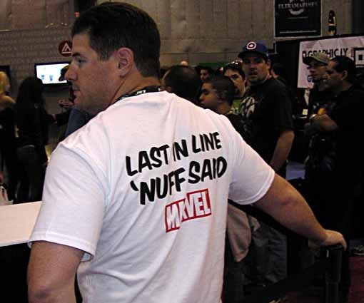 Line control was a problem in many places, where lines blocked aisles, and there didn't seem to be a lot on con attention to that, unlike in San Diego. DC and Marvel, at least, have their own line police. Love the shirt on this guy.