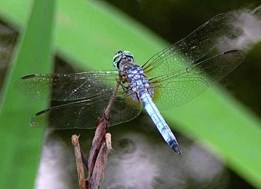 A few pics from the last two weeks, from the front yard as well as the back. This is a small dragonfly, one of two living around our pond. It's a Blue Dasher, and it does dash about over the water frequently. Can't really see it here, but the head is iridescent green with white spots.