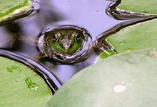 Also in the pond are a few Bullfrogs. I like this view of one among the lily pads, watching me watch him.