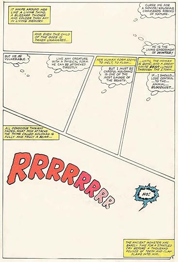 Comics sequences using only words are also rare, but a memorable example is the fight scene in a snowstorm by John Byrne, lettering by Michael Higgins, above, which was controversial at the time, with fans labeling it a stunt and a cheat, if I recall correctly. Nothing wrong with the lettering, though!