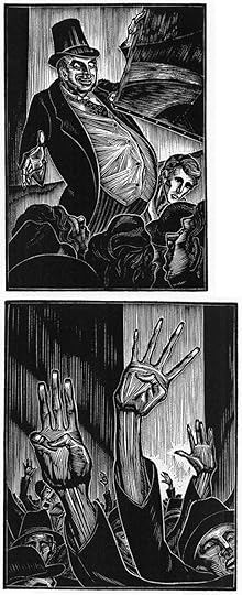 Printing had a large effect on storytelling with words and pictures because it allowed each image to be seen by many more people. Woodblock printing developed in China as early as 220 A.D., first as a method to put images on cloth, then on paper by the fifth century. It had come into use in Japan and Europe by around 1400 A.D. It remains in limited use today, and in the 20th Century, entire books of sequential art were created with it, as in the example shown earlier by Frans Masereel, and the one above by Lynd Ward. Cutting away the areas of each block that would be uninked or white was laborious, but many copies could be made. It was not a process to fill newsstands, though, and creating small but readable lettering with this method was also difficult.