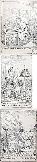Rodolphe Töpffer was a Swiss school teacher with a talent for drawing and caricature. In the 1820s he began drawing humorous stories in a series of panels with captions to amuse his students and friends. The first one drawn, though not the first published, is shown above. It was printed using an early form of lithography called autography that allowed Töpffer to draw with a pen on special paper rather than inscribing lines as in engraving, giving the art a looser and more cartoon-like feel that looks familiar to us today. His captions were written in cursive French below each image, sometimes telling the story, sometimes giving dialogue. This and other similar books by Töpffer are considered the first European comics. An unauthorized translation of Histoire de Mr. Vieux-Bois, replacing the cursive writing with typeset text, was published in England in 1841 and in the United States in 1842 as The Adventures of Mr. Obadiah Oldbuck, now considered the first American comic book.