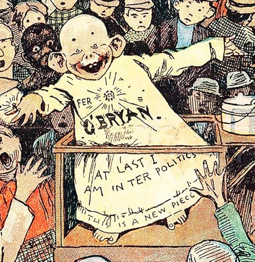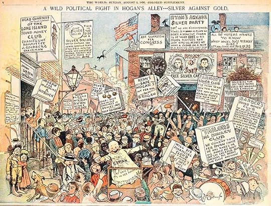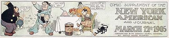Comic strips as a form of storytelling developed gradually in America from the late 1880s to the late 1890s. One impetus was the circulation war between two New York City newspapers, Joseph Pulitzer’s New York World and William Randolph Hearst’s New York Journal. Both papers developed hugely popular Sunday color supplements made possible by new four-color rotary presses and photographic reproduction. In addition to many other kinds of features, they ran what we now call comic strips. Artists were able to draw images with pen and ink, and those images were photographically reproduced as black line art. Color was added by a separate photographic process. One of the earliest comic strips was Hogan’s Alley by Richard F. Outcault, who had begun doing political cartoons for the humor magazines a few years earlier. Outcault started working for Pulitzer’s newspaper in 1894, and was lured to Hearst’s paper in 1896 where he did a similar strip. The original Hogan’s Alley was then taken over by George Luks.