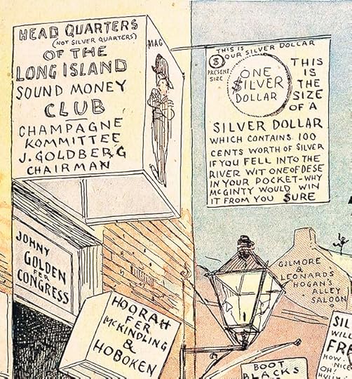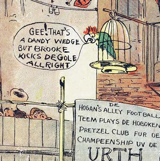 Hogan’s Alley and Outcault’s other strips had lots of lettering, most of it on signs. The featured character, a bald-headed barefoot boy in a long nightshirt, who became known as The Yellow Kid, had his dialogue written on his shirt, though Outcault and Luks occasionally also used word balloons for other characters.