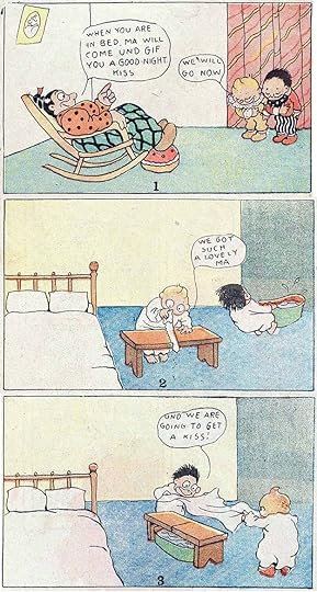 One of the first strips to tell stories in a series of panels was about two naughty boys and their parents, The Katzenjammer Kids, begun by Rudolph Dirks in 1897. It was also one of the first to regularly use speech balloons, as seen in the example. The strip is the longest running in comics history, with new strips appearing until 2006, and it’s still appearing in reruns. Once strips like these proved to Hearst and Pulitzer that they sold newspapers, comic strips and their creators had found a permanent place in American popular culture, and that popularity spread to the rest of the country and later the rest of the world. Characters such as The Katzenjammer Kids, The Yellow Kid, Outcault’s Buster Brown, Frederick Burr Opper’s Happy Hooligan and his Alphonse and Gaston, Bud Fisher’s Mutt and Jeff and others became well known to readers who followed them avidly in the Sunday supplements and later on the daily comics page. Not only were the strips a success, so were the cartoonists, who were often the subject of salary bidding wars between rival publishers like Hearst and Pulitzer.