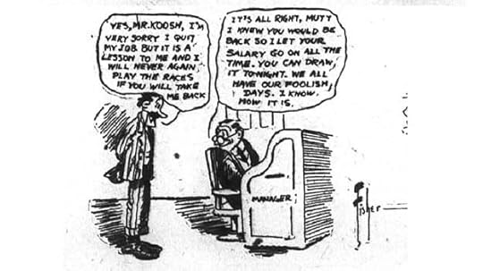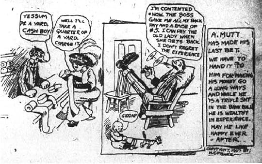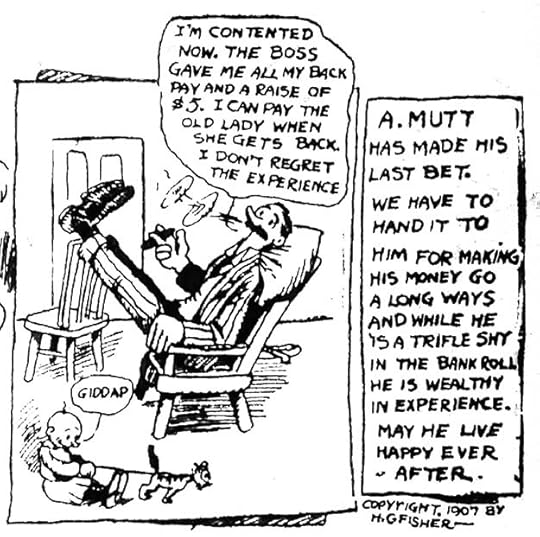 Harry Conway “Bud” Fisher was born in Illinois in 1885. He was a sports cartoonist for The San Francisco Chronicle in the early 1900s. On November 15, 1907 he began a daily comic strip on the sports page titled A. Mutt about a hapless fellow betting on horse races. Fisher’s was the second attempt at a daily strip, the first being A. Piker Clerk by Clare Briggs, which lasted mere months starting in 1903 in The Chicago American. After only a few weeks, Fisher’s strip was noticed by William Randolph Hearst, who made a deal with Fisher to bring it to his paper, The San Francisco Examiner. In the final A. Mutt strip by Fisher in The Chronicle on December 10, 1907, the artist lettered a copyright notice into the bottom right corner, “Copyright 1907 by H. C. Fisher.” The Chronicle let it go by, or perhaps no one noticed it, but this small bit of lettering allowed Bud Fisher to gain control over the copyright of his strip, and stop The Chronicle running a version by another artist. The following year Fisher’s strip gained another main character, Jeff, and Mutt and Jeff went on to become one of the longest-running and most popular comic strips in America. Fisher moved his property several times to different distributors, gaining income and licensing rights, and the characters were in a series of films. By 1916 he was making more than $150,000 a year, an immense sum then, when the average yearly income was about $700. That barely noticeable bit of lettering changed the course of Fisher’s life, and also changed comics history, establishing an early example of creator ownership that others would strive to follow in the decades to come.