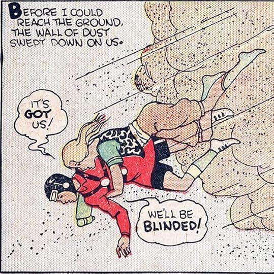 Eventually sound effects grew larger for really loud sounds, like explosions. The second panel above I think shows the hot air balloon exploding, and the sound effect is almost big enough to reflect that, though impact is lost by having it made of thin lines.