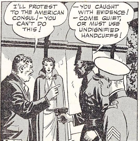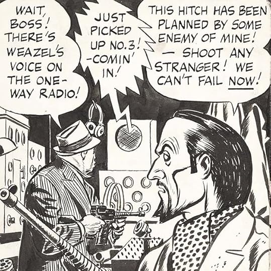 In Terry and the Pirates, a voice from a radio is surrounded by a jagged burst and has an electrical or lightning bolt tail. This is another style I think Frank Engli created that was imitated by others, and it became a standard style for balloons to radios, TVs, and loudspeakers. Engli stuck with the long dash for an interruption in speech.