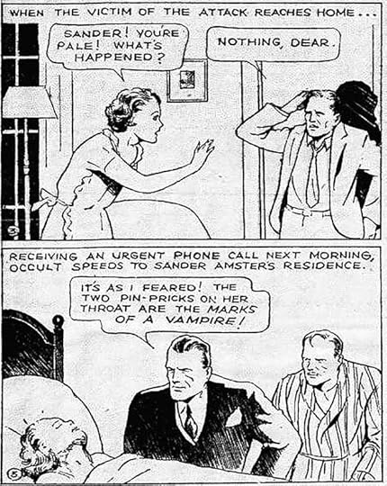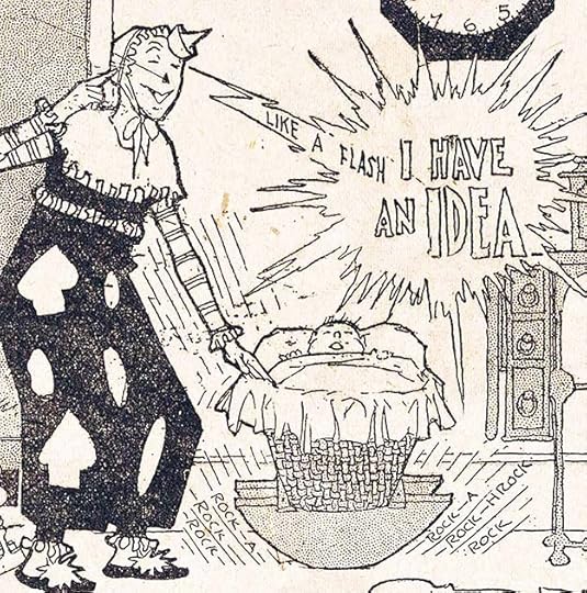 Sometimes early sound effects were even smaller than the balloon lettering. I suppose this door bell might have been a quiet one, though the radiating motion lines help draw the eye to it. Note also the long dash at the end of this word balloon, suggesting unfinished or interrupted speech.