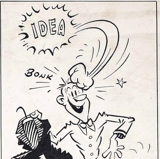 Sounds continued to grow bigger and more visible. Here ZING! is tiny but PLOP is quite large for the amount of noise it probably made, which adds to the humor. The punctuation in the balloon is odd, and hard to interpret out of context. Note again the long dashes suggesting interrupted speech.
