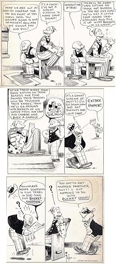 With the success of Bud Fisher’s daily Mutt and Jeff, newspapers increasingly wanted daily comic strips too, and as the century progressed, syndicates asked for six daily strips and one large Sunday strip each week for most features. Some creators, like George Herriman on Krazy Kat, were up to the task, but it was a workload few artists could handle on their own. Syndicates who controlled a strip could hire one artist for the Sunday page, another for the dailies. Even then, those artists might hire assistants to keep up with deadlines. Successful strips where the artist was in control also often used hired help. In that way, making comic strips became divided into specialties. The strip creator, whose name was on it, might only pencil the strip, or just the main figures, hiring assistants to pencil backgrounds, ink everything, and do the lettering, one of the easiest parts of a comic strip to delegate. Bud Fisher’s Mutt and Jeff added a Sunday page in 1918, and Fisher became increasingly dependent on assistants after that. Some that are known are Billy Liverpool (the pen name of Myer Marcus), Ed Mack, Ken Kling, George Herriman and future children’s book author/artist Maurice Sendak. We don’t know who did what exactly, but it’s very likely assistants were doing the lettering. Fisher lost all interest in drawing the strip in the 1930s, and he was wealthy enough so he didn’t need to. Starting in 1932, Al Smith became the main artist, and he continued on Mutt and Jeff until 1980, an amazing run of 48 years. (Thanks to Alex Jay for much of that research, and more on later assistants.)