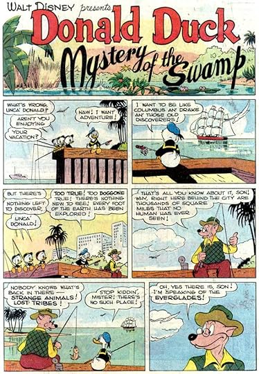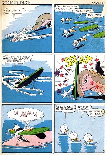 I find this the most creative and interesting story title by Barks, the character logo is beautifully done, and I love the way the story title extends into the water, adding depth and impact. By this time, Carl’s balloon lettering has gotten a bit wider, and emphasized words are not only bolder but a little larger. Again you can see Barks striving for more than cartoon art.