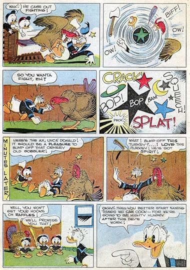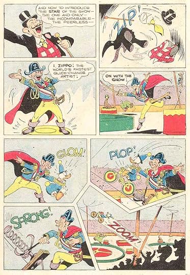 At other times, Donald gets into trouble trying out a new job, like a clown here, where the story is played for laughs, helped by Barks’ energetic sound effects. I particularly like GLOM! as the ringmaster grabs clown Donald by the neck. It’s a rarely used word from the Scots “glaum,” to grab.