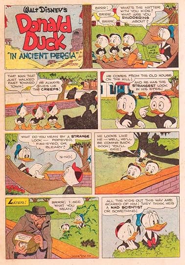 The longer adventure stories in FOUR COLOR allowed Barks to take Donald and his nephews on thrilling adventures around the world, stories with drama, intriguing plots and nefarious characters like the Mad Scientist seen above, but there was always plenty of humor as well. I like the title of the book Donald’s reading.