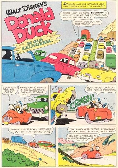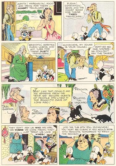 In this page from the story, we see Donald and his nephews entering the world of old Spanish California, with great character name lettering by Barks in the wide panel. Most of the human-like characters by Barks had dog noses to retain just a bit of animation style, but Carl was doing more realistic art than what was usually seen in Disney comics. Readers appreciated his extra effort, and labeled him “the good duck artist” for it.