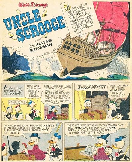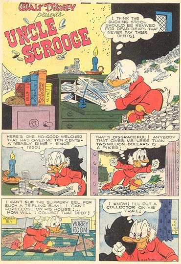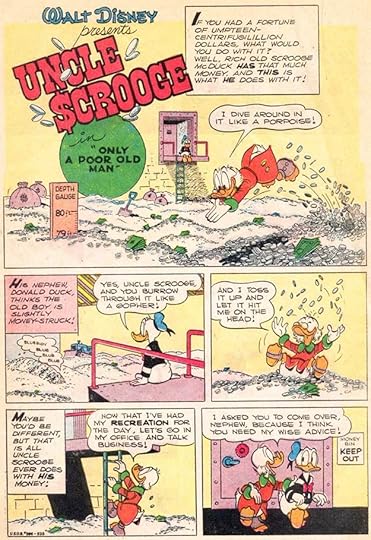 This story is considered the first issue of Uncle Scrooge’s own series, and Barks has fun with the character’s bin full of money. I don’t know if Carl designed this Scrooge logo, he might have. His captions are slanted, and the first letters are much larger and bolder.