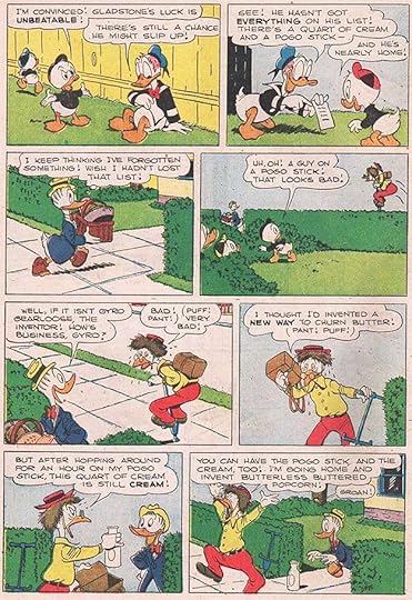 This story introduced another favorite Barks character, the chicken-like inventor Gyro Gearloose. Carl’s lettering remains consistent and appealing, always retaining a cartoony bounce. Note the old-style breath marks around Gyro’s panting, parentheses.