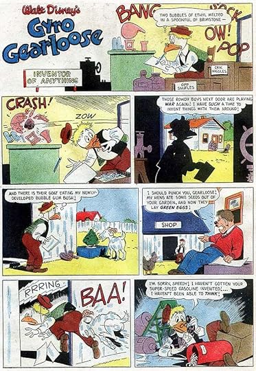 After a while, Garé’s own lettering style emerged. Her letters were smaller and narrower than Carl’s, which left more room for the art. Carl probably penciled these sound effects, and Garé inked them, but hers also have narrower strokes, and are more rounded. They work fine. She probably inked the character logo over Carl’s pencils too. Nearly all the Gyro Gearloose appearances have her lettering.