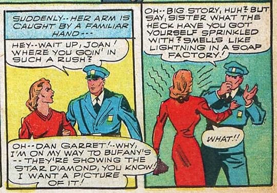 I see lots of superhero stories lettered by Ed in his Howard Ferguson style in other Pines comics, another example is above. He may have also been doing the cover logos, I’m less sure about most of those. Note the whisper balloons with dotted outlines, and a radio balloon in the second panel with a zig-zag tail but shaped like a thought balloon.
