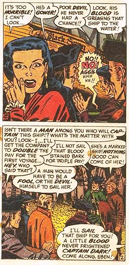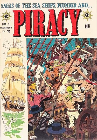 In 1954, the publication of Frederic Wertham’s Seduction of the Innocent and a highly publicized Congressional hearing on juvenile delinquency cast comic books in an especially poor light. Several comics publishers formed the Comics Magazine Association of America and its Comics Code Authority. The CCA code was rigorously enforced, with all comics requiring code approval prior to their publication. Gaines refused to join the association. Among the Code’s new rules were that no comic book title could use the words “horror” or “terror” or “weird” on its cover. When distributors refused to handle many of his comics, Gaines ended publication of his three horror and the two SuspenStory titles on September 14, 1954. EC shifted its focus to a line of more realistic comic books known as the New Direction titles. PIRACY, above, was the the first. While still violent, it at least avoided the gore of the horror and crime books, and was more like popular swashbuckling films. I think the logo and top line are by Al Feldstein, though it’s possible letterer Ben Oda had a hand in them. The ship wheels around the EC bullets are a nice touch.