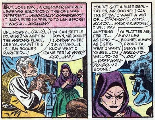 A new logo on this issue of TALES FROM THE CRYPT is one I find creepy and effective, with drippy letters on CRYPT and very rough block letters on TALES. Feldstein’s cover art is more gruesome than what came before, and the three horror hosts he created are in boxes at the left side. That idea of creepy characters introducing stories and talking directly to readers is one that Feldstein and Gaines came up with as far as I know, and it was soon copied by others. It was even imitated on TV with horror movie/anthology hosts like Zacherly and Vampira, and possibly even Alfred Hitchcock. Certainly Hitchcock brought the same kind of droll humor as the hosts in the EC comics.