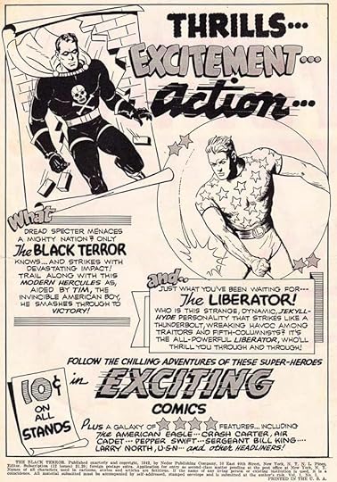 Another house ad by Hamilton, again following styles used by Howard Ferguson in his Timely/Marvel house ads, but with Ed’s own personal style present as well, like the character names at the bottom whose letters seem to bulge out at the middle and have extra side angles. He might have designed the EXCITING COMICS logo, that’s one I’m not sure about.