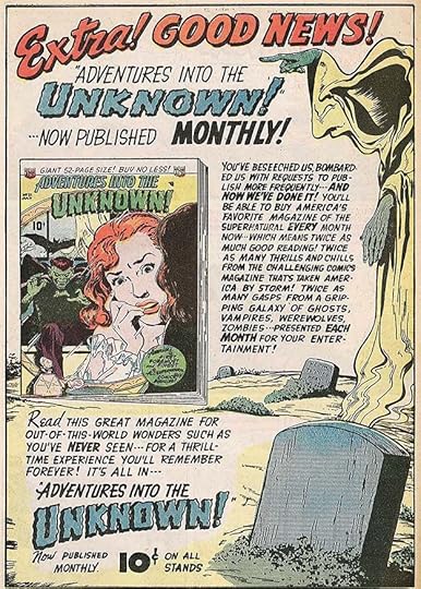 The second “horror” title from ACG was similar to the first, and did equally well, running 145 issues to 1967. The ACG horror titles are the ones I remember seeing as a child. I found them interesting, but usually opted for superheroes with my money. I like the rough bottom edges and texture in the logo. Note that first issues rarely had “No. 1” on them. Newsstands were already overcrowded, and owners were reluctant to put out new titles. Companies hoped that by not putting the issue number on first issues, they might get some owners who weren’t paying attention to put them out. It must have worked.