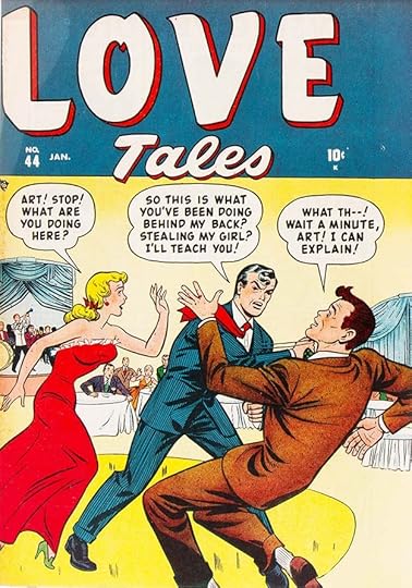 On this romance title, the logo uses ball serifs, something I think Simek did elsewhere, but the letters are kind of thick and clunky otherwise, and the balloon lettering is definitely not by Artie. Still, the logo is probably his.