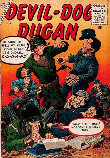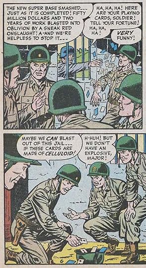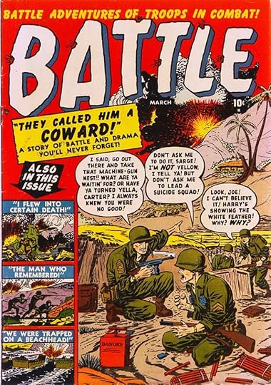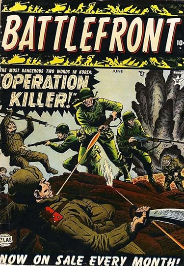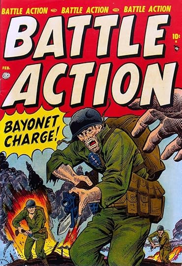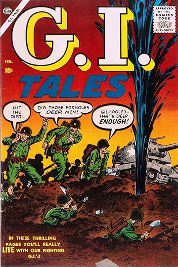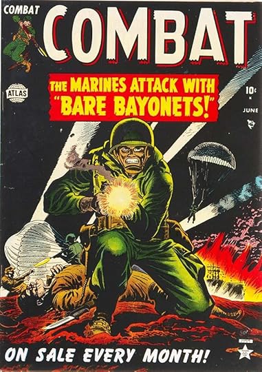 This logo is similar to G.I. COMBAT published by Quality Comics, and later for many years by DC Comics. The art reminds me of FRONTLINE COMBAT from EC Comics, and the artist, Russ Heath, also worked there. War titles were clearly selling. Fine large caption by Simek.