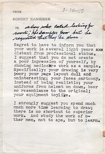 Here’s a rejection note from editor Robert Kanigher. I’m not sure why Perry had it, but he pasted it into his notebook. I find the criticisms harsh, but of course we don’t see the work it’s written about, probably samples for Kanigher’s war titles.