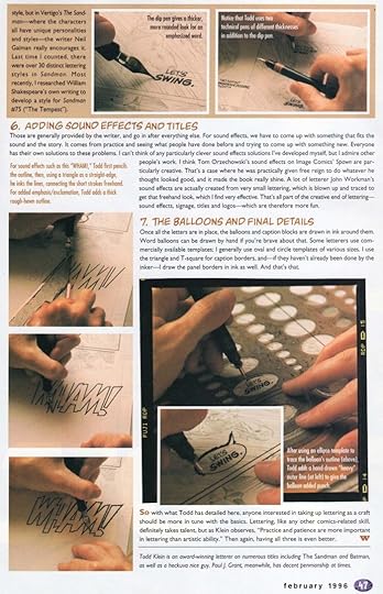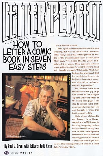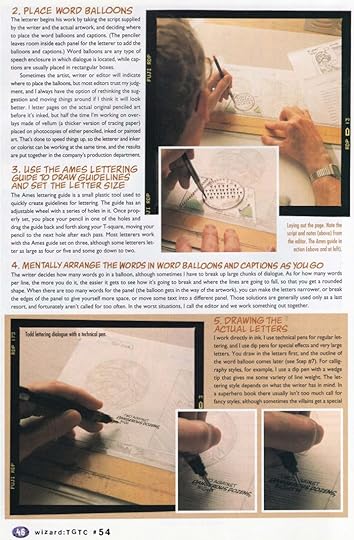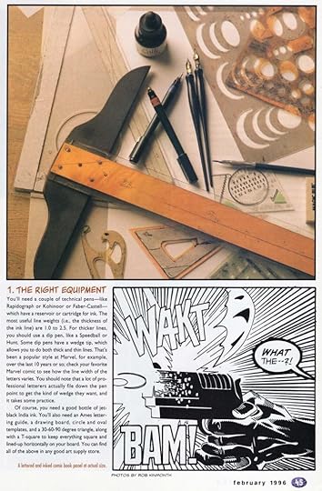 In 1996, when I was 45, I was already beginning to letter digitally, but the majority of my lettering was still done by hand. I was contacted by writer Paul Grant, who I knew through Compuserve I think, about doing a how-to article for WIZARD magazine, then a popular newsstand monthly used as a resource for comics fans, collectors and buyers. I agreed, and planned out a tutorial with Paul that would be illustrated with photos taken in my studio as well as my hand-lettered title and item numbers. I can’t recall exactly how the writing process went, but I probably sent my suggested text to Paul and he put it in the final form seen here. I can see he made some clarifying additions. I found my copy of the magazine recently, and while some of the type is small, I thought the four page article might be of interest.