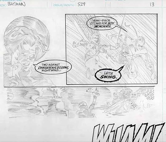 I did have photocopies of a recent Batman story, and a blank piece of DC art paper, so I created my own penciled panels by tracing over a photocopy on my light box to give me what I needed. A finished inked panel Xerox is on the second page of the article, above, while on page 3 is my imitation pencil art being lettered, original above.